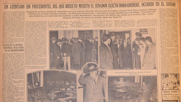 "Un atentado sin precedentes en la vida parlamentaria en el país, puso una nota trágica en la reunión efectuada ayer por el Senado", tituló La Prensa en tapa, con grandes letras, aquel miércoles 24 de julio de 1935. Y agregó: "Fue muerto a balazos el senador electo por Santa Fe, doctor Enzo Bordabehere, y resultaron heridos el Ministro de Agricultura, ingeniero Duhau, y el diputado Rafael Mancini".