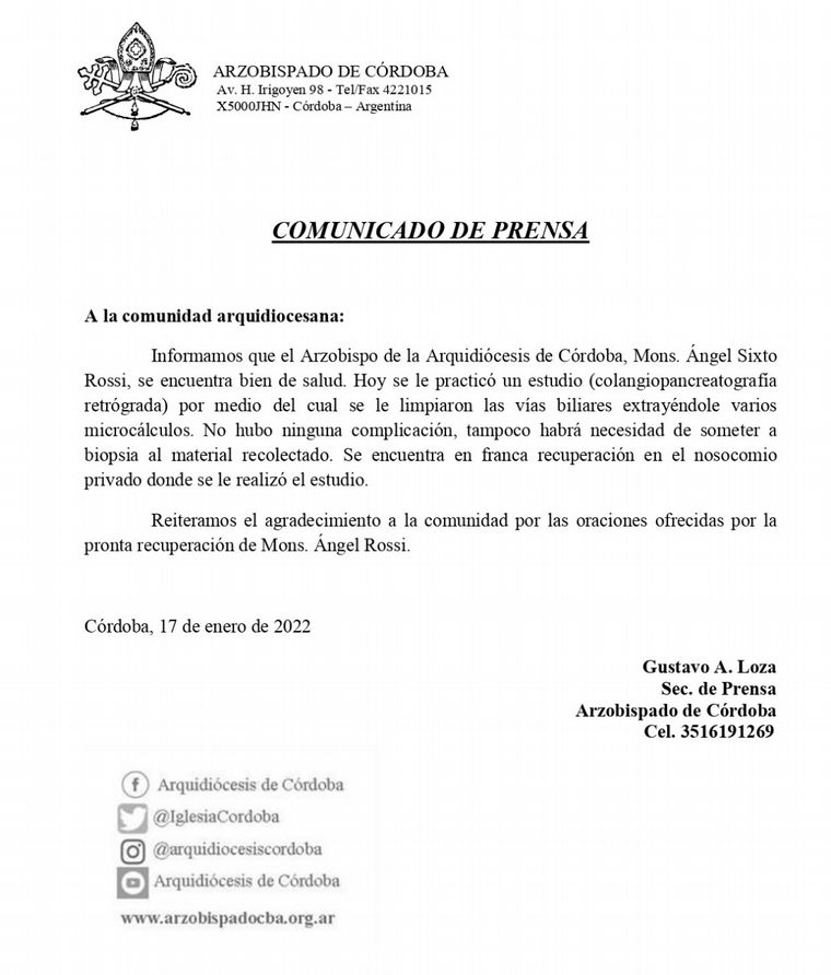 "Reiteramos el agradecimiento a la comunidad por las oraciones ofrecidas por la pronta recuperación de monseñor Rossi”, finaliza el texto difundido por el Arzobispado.
