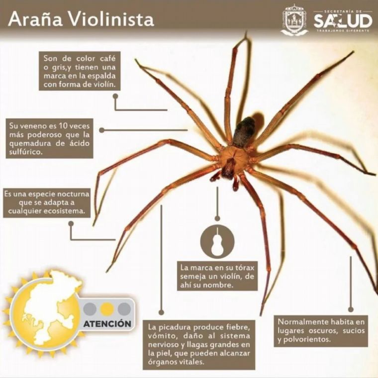 También es conocida como “araña violinista”, por la forma que toma la herida de su mordedura en la piel.