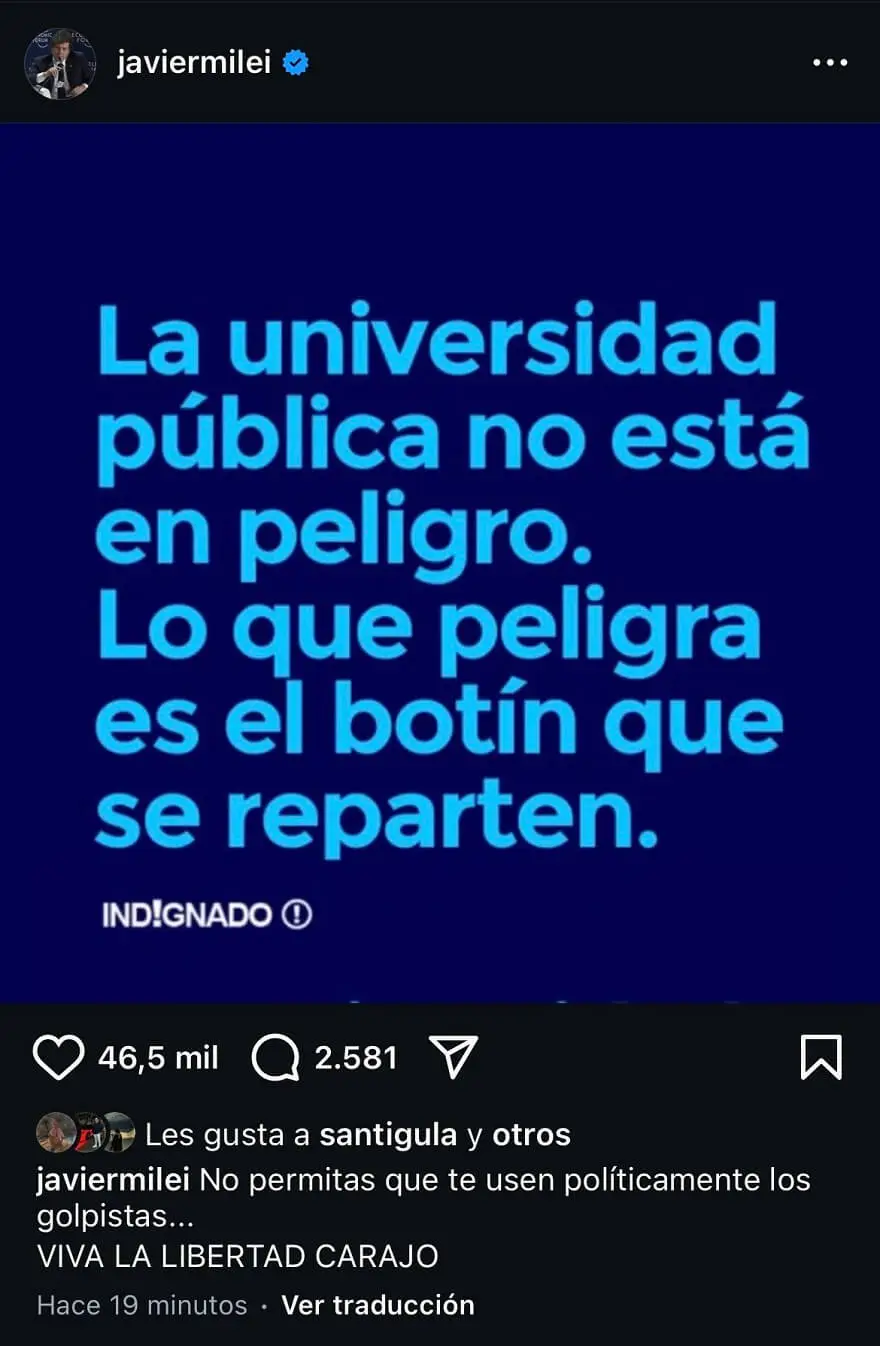 En su cuenta de Instagram, antes Milei había escrito: "No permitas que te usen políticamente los golpistas". A ese mensaje lo acompañó con una placa que decía: "La universidad pública no está en peligro. Lo que está en peligro es el botín que se reparten".