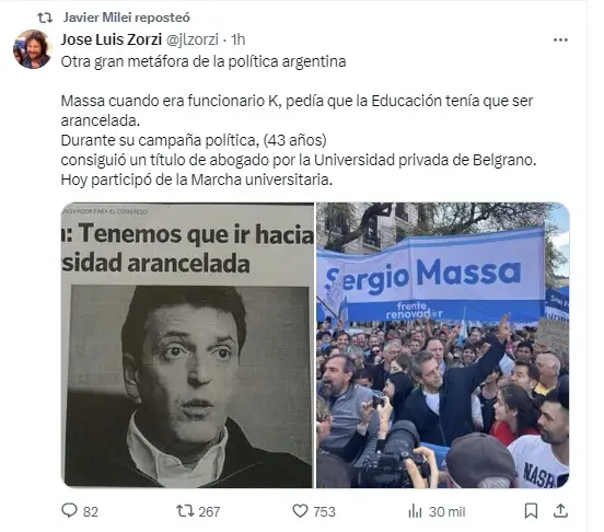 También reposteó un mensaje del diputado Agustín Romo: "Cristina Kirchner, Martín Lousteau y Sergio Massa marchando juntos en contra de auditar en qué gastan la plata las universidades públicas. Por si faltaba algo para darse cuenta de qué lado estar. Todos fueron parte de la decadencia argentina que nos dejó 50% de pobreza".