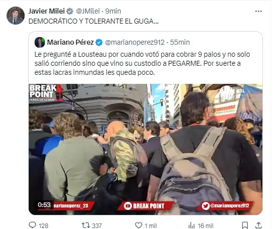 "Esto no es una marcha universitaria, sino una marcha de parásitos que viven de los impuestos, es decir, del hambre de la gente", escribió otro usuario, que fue reposteado por Milei.