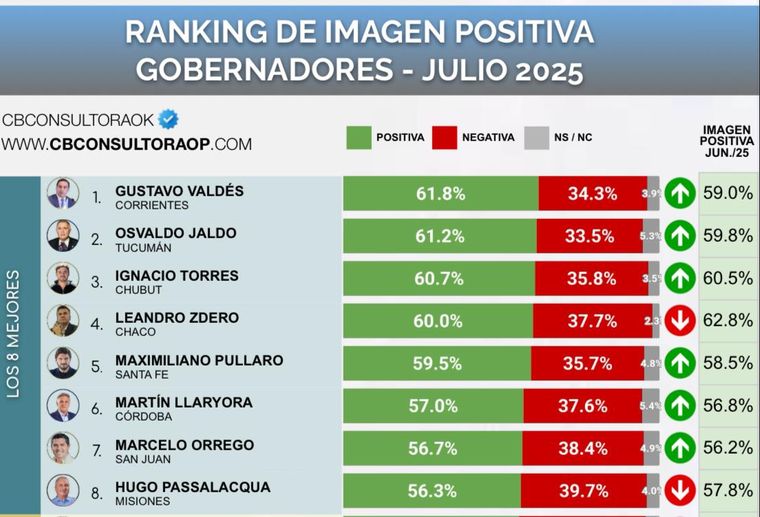 Valdés es el mejor valorado en el ránking con un 61,8%, seguido por Osvaldo Jaldo, de Tucumán, con un 61,2%; y en tercer lugar Ignacio Torres, de Chubut, con un 60,7%. Después continúan el chaqueño Leandro Zdero, el santafesino Maximiliano Pullaro, y el cordobés Martín Llaryora.